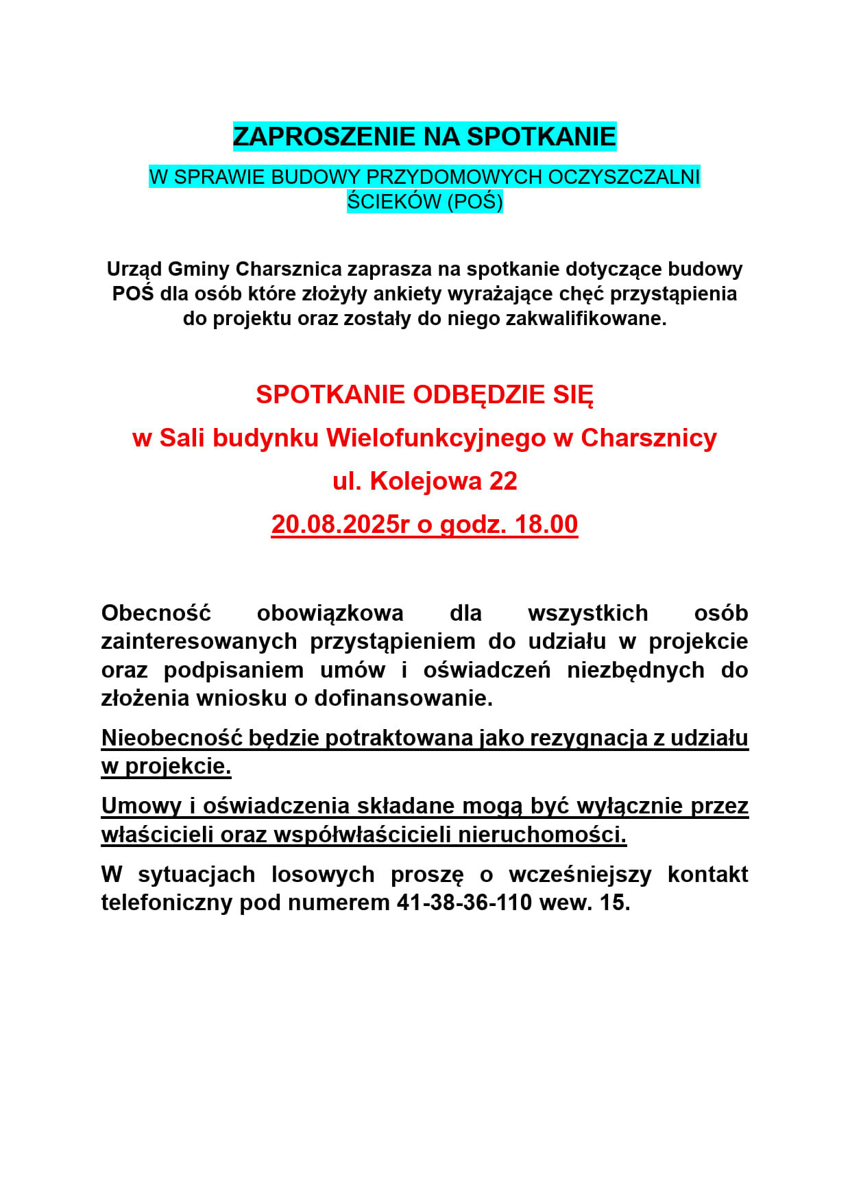 Zaproszenie na spotkanie w/s budowy przydomowych oczyszczalni ścieków.